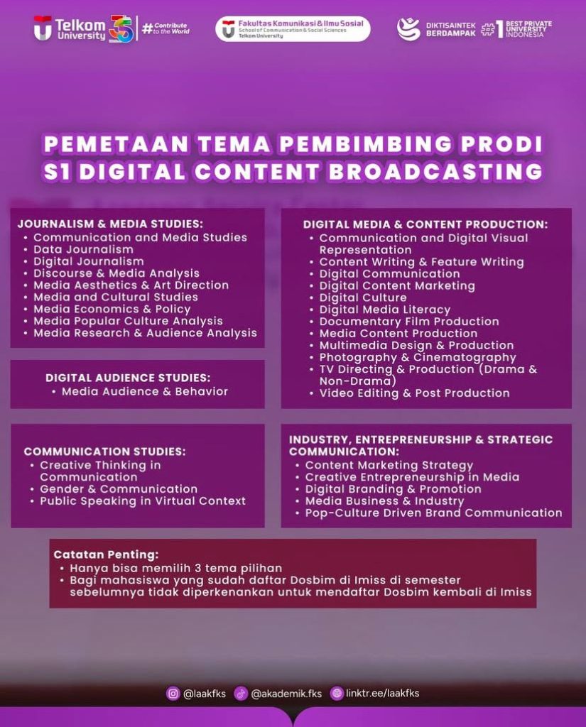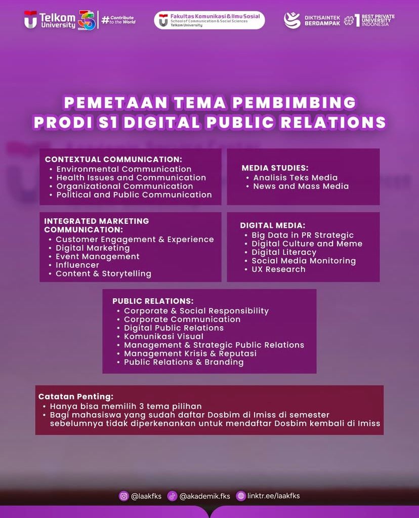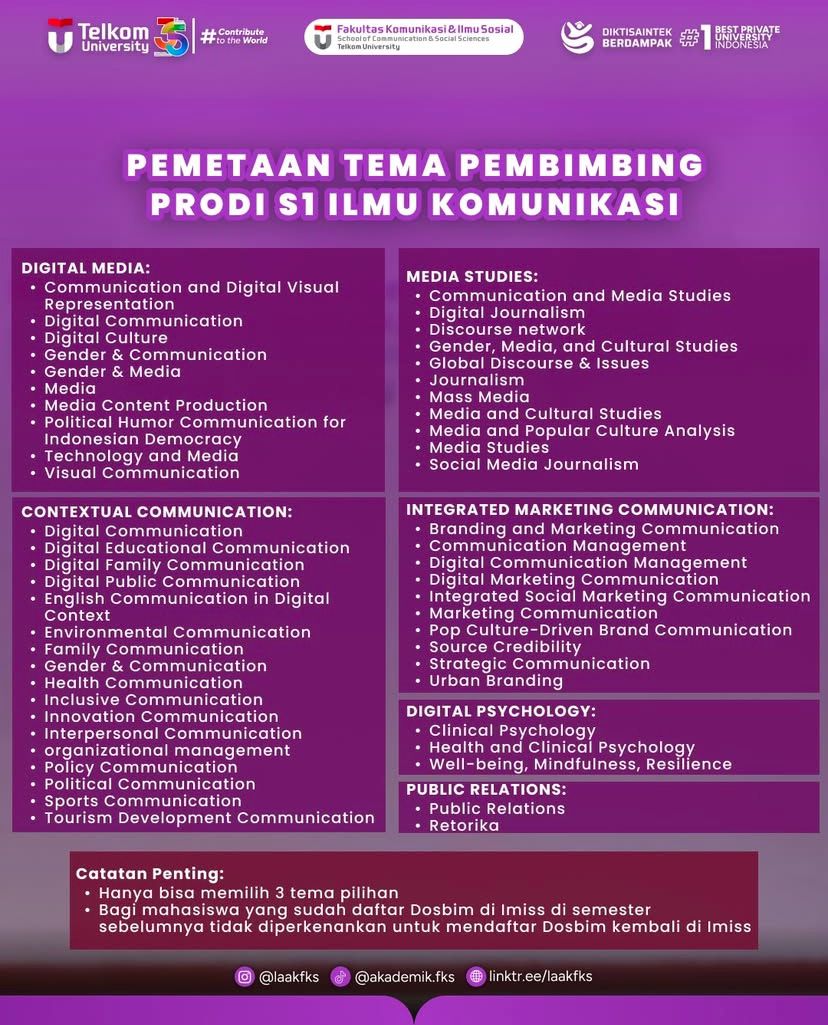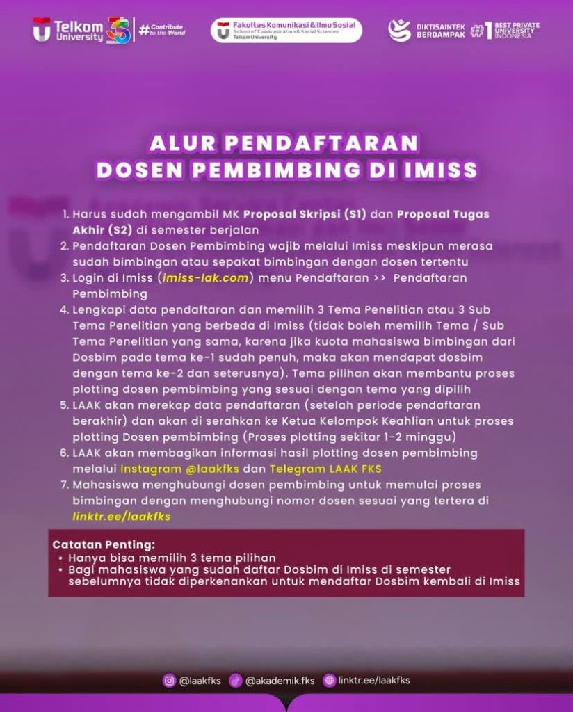Kami informasikan terkait alur Pendaftaran Dosen Pembimbing di Imiss dan Pemetaan Tema Pembimbing di setiap Prodinya bisa mendaftarkan langsung ke website Imiss https://imiss-lak.com