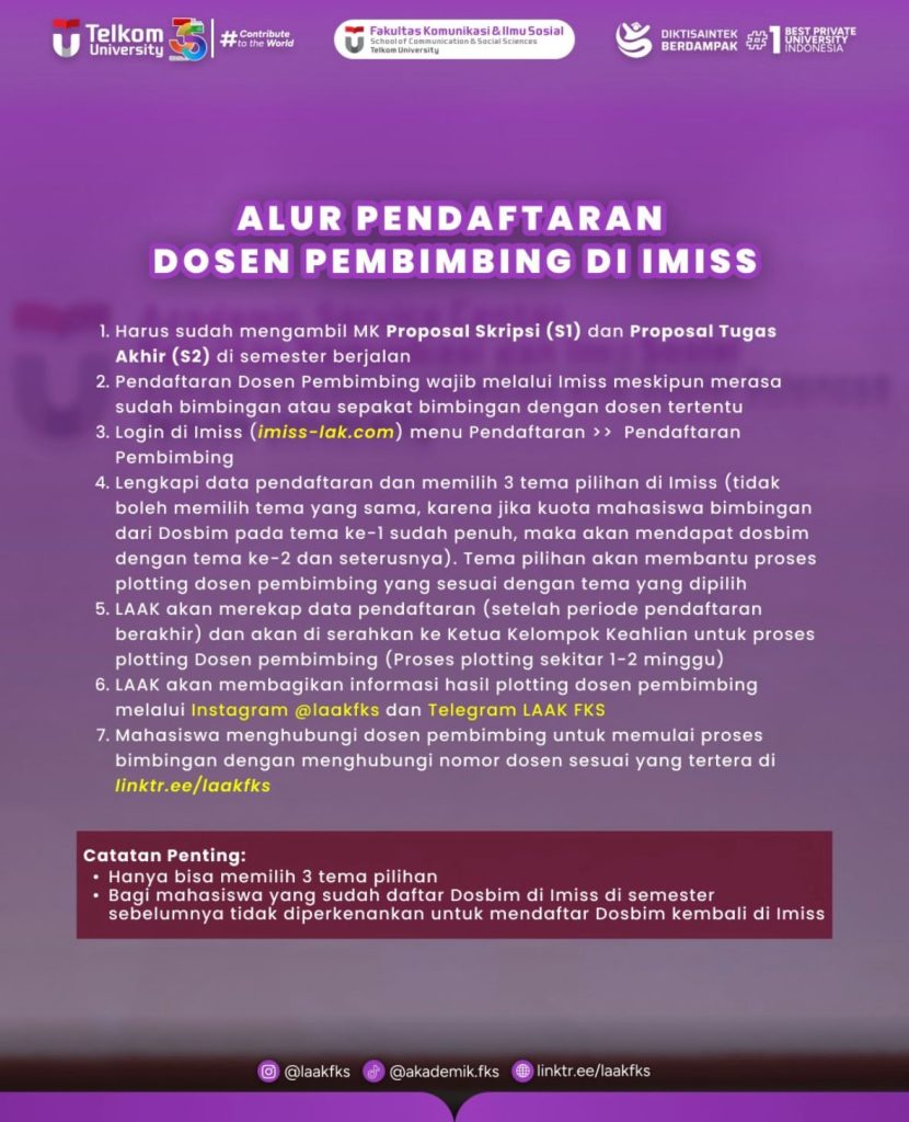 Pendaftaran Dosen Pembimbing wajilo melalui Imiss meskipun merasa sudah bimbingan atau sepakat bimbingan dengan dosen tertentu Kami informasikan terkait alur Pendaftaran Dosen Pembimbing di Imiss dan Pemetaan Tema Pembimbing di setiap Prodinya bisa mendaftarkan langsung ke website Imiss: https://imiss-lak.com